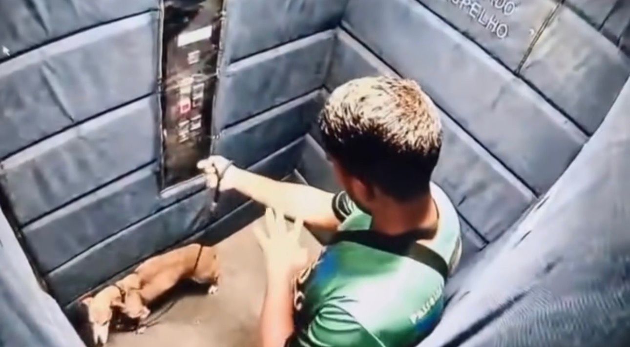 Câmeras de segurança registraram o momento em que o homem entra no elevador acompanhado do animal e, de forma repentina, puxa a coleira com força, provocando sufocamento no cão. As imagens circulam nas redes e foram usadas para formalizar a denúncia na delegacia.